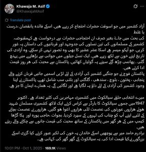 وفاقی وزیر دفاع خواجہ آصف نے اپنے ایکس اکاؤنٹ پر جاری پیغام میں آزاد کشمیر کے عوام سے پرامن رہنے کی اپیل کی ہے۔خواجہ آصف نے کہا کہ احتجاج کرنے والے حضرات مقبوضہ کشمیر کی تین نسلوں کی جدوجہد پر غور کریں، جنہیں وہ سہولتیں بھی میسر نہیں جو آج آزاد کشمیر کے عوام کو حاصل ہیں۔وزیر دفاع کے مطابق کشمیری عوام نے آزادی کی تاریخ اپنے خون سے لکھی ہے،