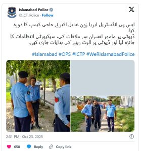 اسلام آباد پولیس کے سرکاری ایکس اکاؤنٹ پر ان کے دورے کی تصاویر بھی جاری کی گئی تھیں، جن میں وہ سکیورٹی اہلکاروں سے ملاقات کرتے اور انہیں الرٹ رہنے کی ہدایت دیتے نظر آئے۔