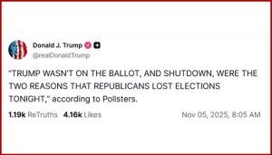 الیکشن نتائج سامنے آنے کے بعد ٹرمپ نے اپنی سوشل میڈیا پلیٹ فارم “ٹروتھ سوشل” پر پوسٹ کرتے ہوئے کہا کہ ریپبلکن امیدوار کی ناکامی کی دو بڑی وجوہات ہیں پہلی یہ کہ وہ خود بیلٹ پر موجود نہیں تھے، اور دوسری وجہ امریکا میں جاری حکومتی شٹ ڈاؤن ہے جس نے عوامی اعتماد کو متاثر کیا۔