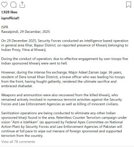 خار باجوڈ میں آپریشن ، 5 خارجی ہلاک،فائرنگ کے تبادلے میں میجر شہید