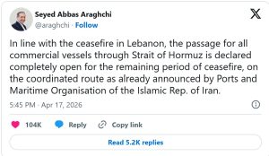 ایرانی وزیر خارجہ عباس عراقچی نے سماجی رابطے کی ویب سائٹ ایکس (سابقہ ٹوئٹر) پر اپنے بیان میں کہا کہ آبنائے ہرمز کو تمام تجارتی جہازوں کے لیے مکمل طور پر فعال کر دیا گیا ہے اور جنگ بندی کے باقی عرصے کے دوران یہ بحری راستہ کھلا رہے گا۔